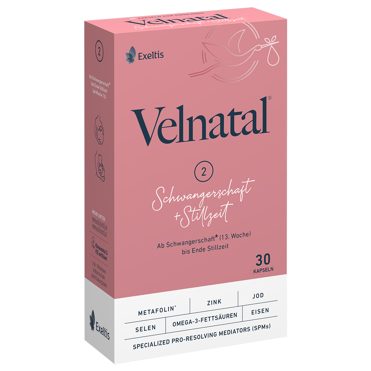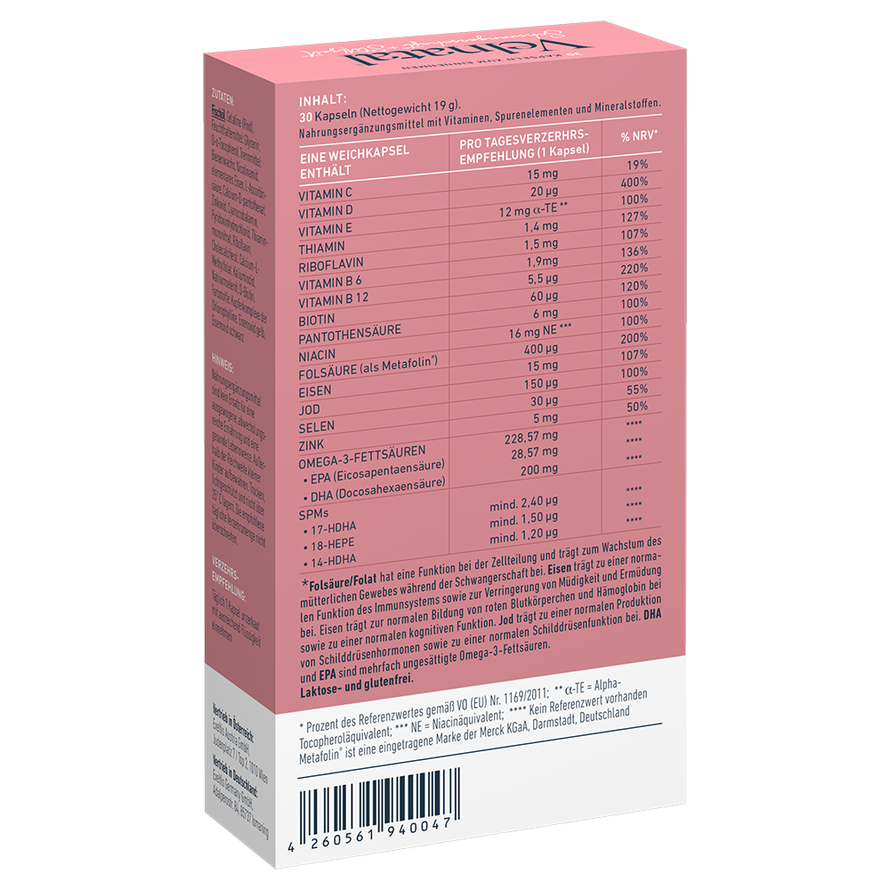 Kommission vom 24.Oktober 2014. Verfügbar unter: https://eur-lex.europa.eu/legal-content/DE/TXT/HTML/?uri=CELEX:32014R1135 (letzter Zugriff: 17.11.2023); 9. Isaković J, Šimunić I, Jagečić D et al. Overview of Neural Tube Defects: Gene-Environment Interactions, Preventative Approaches and Future Perspectives. Biomedicines, 2022; 10(5): 965. doi:10.3390/biomedicines10050965; 10. Deutsche Gesellschaft für Ernährung. Referenzwert Jod. Verfügbar unter: https://www.dge.de/wissenschaft/referenzwerte/jod/ (letzter Zugriff: 18.10.2023); 11. Deutsche Gesellschaft für Ernährung. Ausgewählte Fragen und Antworten zu Selen. Verfügbar unter: https://www.dge.de/gesunde-ernaehrung/faq/selen/#c1506 (letzter Zugriff: 15.12.2025); 12. Deutsche Gesellschaft für Ernährung. Ausgewählte Fragen und Antworten zu Zink. Verfügbar unter: https://www.dge.de/gesunde-ernaehrung/faq/ausgewaehlte-fragen-und-antworten-zu-zink/ (letzter Zugriff: 18.10.2023); 13. Verordnung (EU) Nr. 440/2011 der Kommission vom 6.Mai 2011. Verfügbar unter: https://eur-lex.europa.eu/legal-content/DE/TXT/HTML/?uri=CELEX:32011R0440 (letzter Zugriff: 17.11.2023); 14. Basak S, Mallick R, Duttaroy AK. Maternal Docosahexaenoic Acid Status during Pregnancy and Its Impact on Infant Neurodevelopment. Nutrients, 2020; 12(12): 3615. doi:10.3390/nu12123615; 15. Deutsche Gesellschaft für Ernährung. Ausgewählte Fragen und Antworten zu Vitamin D. Verfügbar unter: https://www.dge.de/gesunde-ernaehrung/faq/vitamind/#c3079 (letzter Zugriff: 15.12.2025); 16. Deutsche Gesellschaft für Ernährung. Vitamin D Referenzwert. Verfügbar unter: https://www.dge.de/wissenschaft/referenzwerte/vitamin-d/ (letzter Zugriff: 15.12.2025); 17. Deutsche Gesellschaft für Ernährung. Vitamin E Referenzwert. Verfügbar unter: https://www.dge.de/wissenschaft/referenzwerte/vitamin-e/ (letzter Zugriff: 15.12.2025); 18. Kennedy DO. B Vitamins and the Brain: Mechanisms, Dose and Efficacy—A Review. Nutrients, 2016; 8(2): 68. doi:10.3390/nu8020068; 19. Koletzko B, Bauer CP, Cierpka M et al. Ernährung und Bewegung von Säuglingen und stillenden Frauen. Aktualisierte Handlungsempfehlungen von „Gesund ins Leben – Netzwerk Junge Familie“, eine Initiative von IN FORM. Monatsschr Kinderheilkd, 2016; 164(9):765-789; 20. Deutsche Gesellschaft für Ernährung. Ausgewählte Fragen und Antworten zu Vitamin C. Verfügbar unter: https://www.dge.de/gesunde-ernaehrung/faq/vitamin-c/ (letzter Zugriff: 15.12.2025); 21. Deutsche Gesellschaft für Ernährung. Referenzwert Eisen. Verfügbar unter: https://www.dge.de/wissenschaft/referenzwerte/eisen/ (letzter Zugriff: 15.12.2025); 22. Serhan CN. Pro-resolving lipid mediators are leads for resolution physiology. Nature, 2014; 510(7503): 92-101. doi:10.1038/nature13479; 23. Elliott E, Hanson CK, Anderson-Berry AL et al. The role of specialized pro-resolving mediators in maternal-fetal health. Prostaglandins Leukot Essent Fatty Acids, 2017; 126: 98-104. doi:10.1016/j.plefa.2017.09.017; 24. Arnardottir H, Orr SK, Dalli J et al. Human milk proresolving mediators stimulate resolution of acute inflammation. Mucosal Immunol, 2016; 9(3): 757-766. doi:10.1038/mi.2015.99; 25. Keelan JA, Mas E, D’Vaz N et al. Effects of maternal n-3 fatty acid supplementation on placental cytokines, pro-resolving lipid mediators and their precursors. Reprod Camb Engl, 2015; 149(2): 171-178. doi:10.1530/REP-14-0549; 26. Bundesministerium für Soziales, Gesundheit, Pflege und Konsumentenschutz. Folsäure (Folat). Verfügbar unter: https://www.gesundheit.gv.at/leben/ernaehrung/vitamine-mineralstoffe/wasserloesliche-vitamine/folsaeure (letzter Zugriff: 15.12.2025); 27. Bundesministerium für Soziales, Gesundheit, Pflege und Konsumentenschutz. Jod. Verfügbar unter: https://www.gesundheit.gv.at/leben/ernaehrung/vitamine-mineralstoffe/spurenelemente/jod (letzter Zugriff: 15.12.2025).