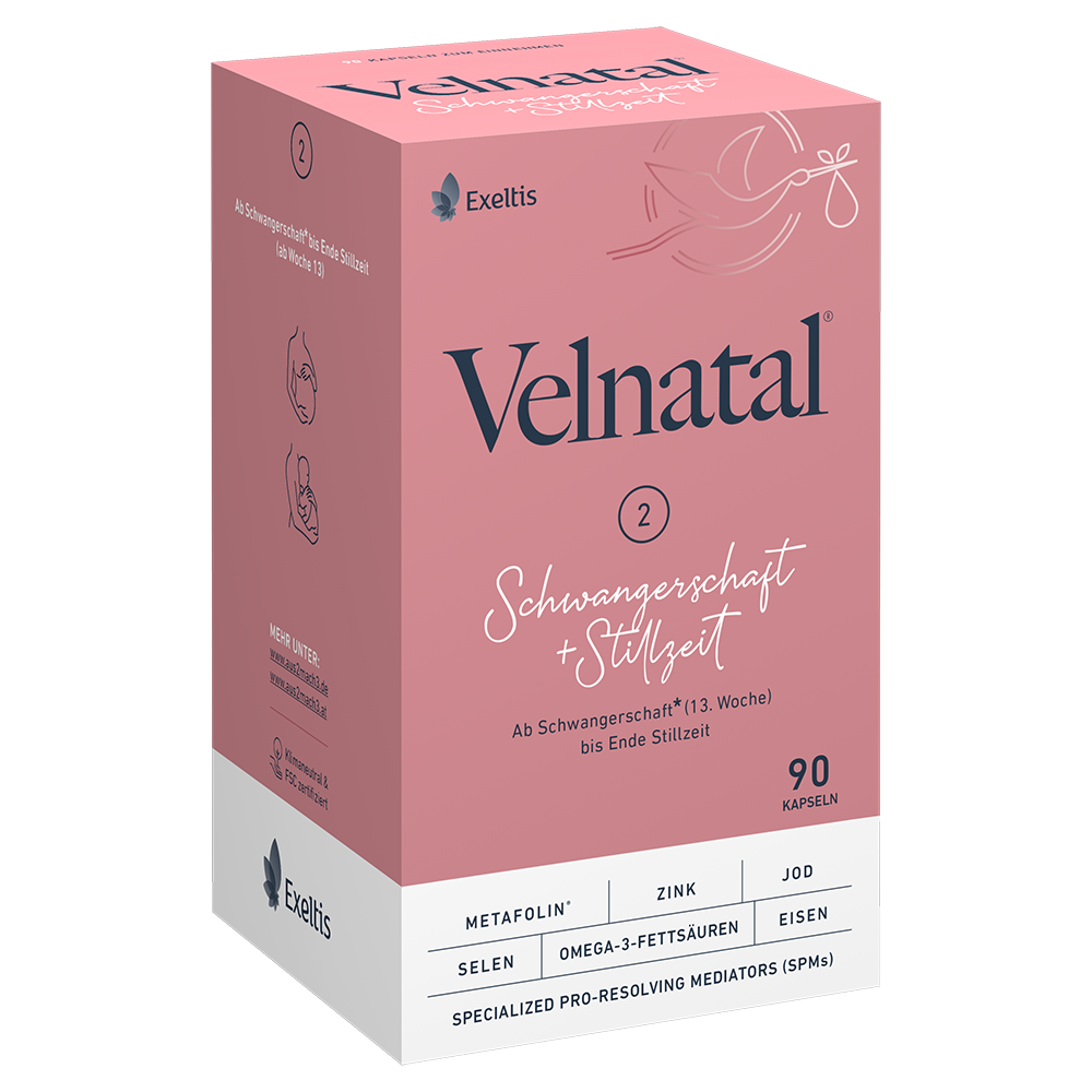 Velnatal® Schwangerschaft + Stillzeit enthält eine Kombination aus Vitaminen, Spurenelementen, Fettsäuren und SPMs, die alle Entwicklungsphasen deines Babys unterstützt. Auch nach der Geburt und während der gesamten Stillphase seid ihr beide mit Velnatal® Schwangerschaft + Stillzeit gut versorgt.
